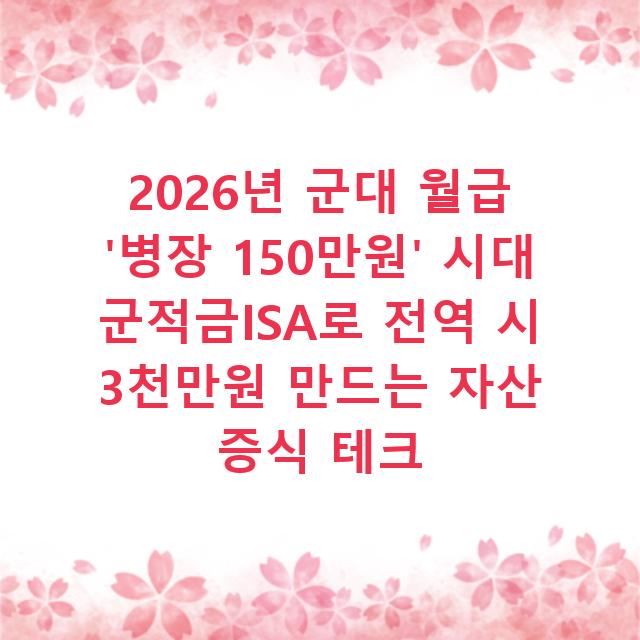 🚀 핵심 요약 3줄 1. 2026년 기준 병장 월급은 150만원 , 여기에 정부 매칭지원금 55만원까지 더하면 월 205만원 수준의 강제 저축이 가능합니다. 2. 군 적금 만기금(약 2천만원)을 전역 직후 비과세 혜택 ISA 계좌로 이관 하면, 10년…
